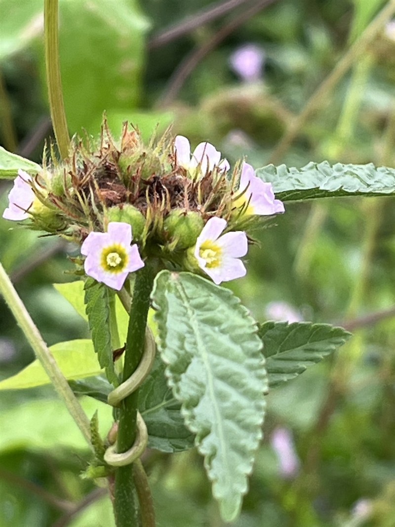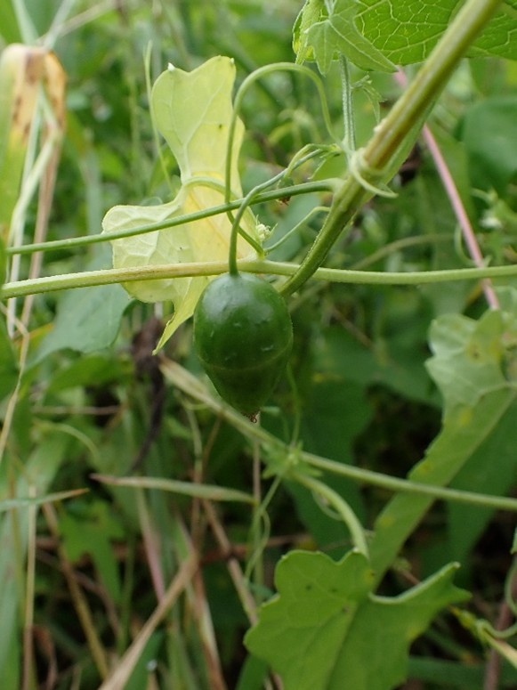 小川沿いの農道から離れて,水田沿いに移動。用水路沿って100m以上の範囲に繁茂するゴキヅルを観察した。2週間前に行った下見では開花はじめだったが,特徴的な果実も多数つけていた。用水路沿いは,一面のコゴメガヤツリに覆われた水田が目立つ。ここ数年は米の作付けも少ないようだ。昨年からの米不足騒動を考えるともったいない気もするが,一度荒らしてしまうと簡単には米作りもできないのだろう。多くはないが,今年の稲刈り後の水田もいくつか確認。クサネムやヒレタゴボウ,イヌビエ,カヤツリグサの類が多かった。ホシクサの仲間を期待したが,見つけることはできなかった。フタバムグラとナガエフタバムグラが観察できた点は面白いと思ったが,水田雑草の類は,種類が少なく少し残念であった。