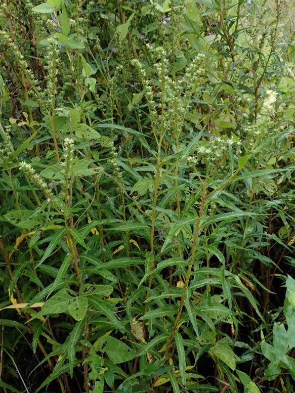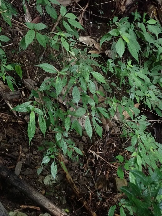 午後からは,土佐市の未採集植物の標本採集を考えていたが,雨となったため,予定を変更し,イラクサ科の落葉低木であるイワガネを見に行くことにした。土佐市出間に自生するイワガネは高知県の天然記念物に指定されており,土佐市のホームページでも紹介されている。コミュニティーセンターの隣の集落だったので歩いていくことにした。自生地の入り口には看板が設置されていたが,民家の庭を横切るようなルートで,ちょっと気が引ける。谷筋の斜面を少し上ると天然記念物である旨の石碑があり,谷側に数株のイワガネを観ることができた。観察後は,果樹園の生け垣に絡みついた満開のニガカシュウ等を観察しながらコミュニティーセンターに引き返し,少し早かったが,14:30に解散とした。